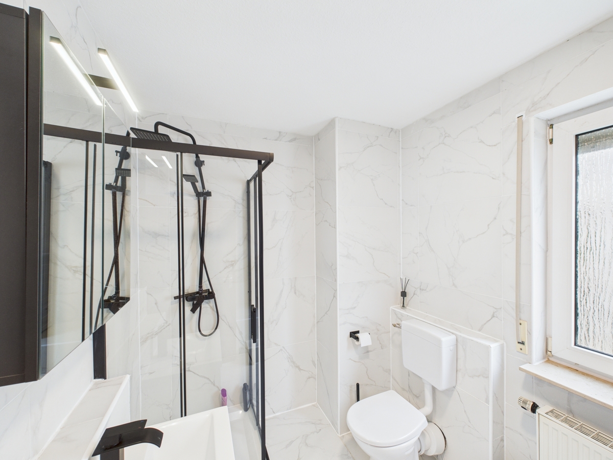 Ein modernes Tageslichtbad mit Dusche, WC und mit erhöhtem Waschmaschinen- und Trocknerplatz sorgt für maximalen Komfort. Kein Bücken zum befüllen von Waschmaschine und Trockner notwendig.