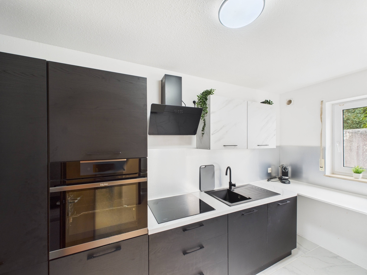 Die angrenzende Einbauküche ist funktional gestaltet und bietet alles, was das Herz begehrt.