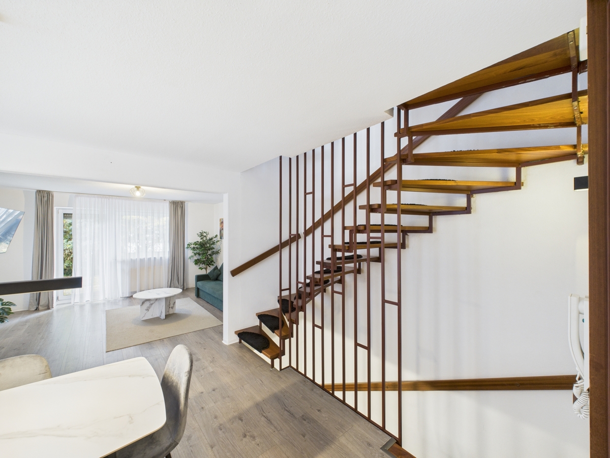 Im Erdgeschoss empfängt Sie ein einladendes, helles Wohnzimmer, das mit einem Essbereich verbunden ist.