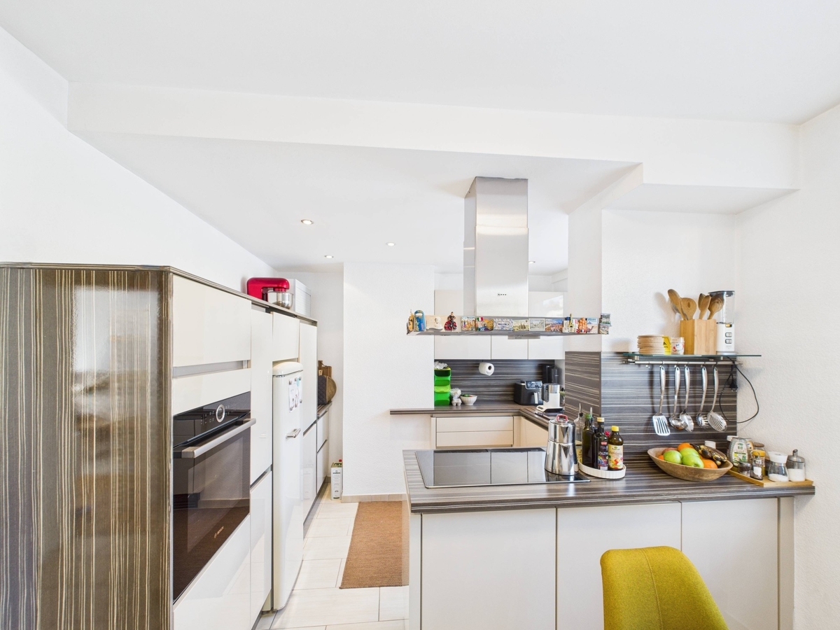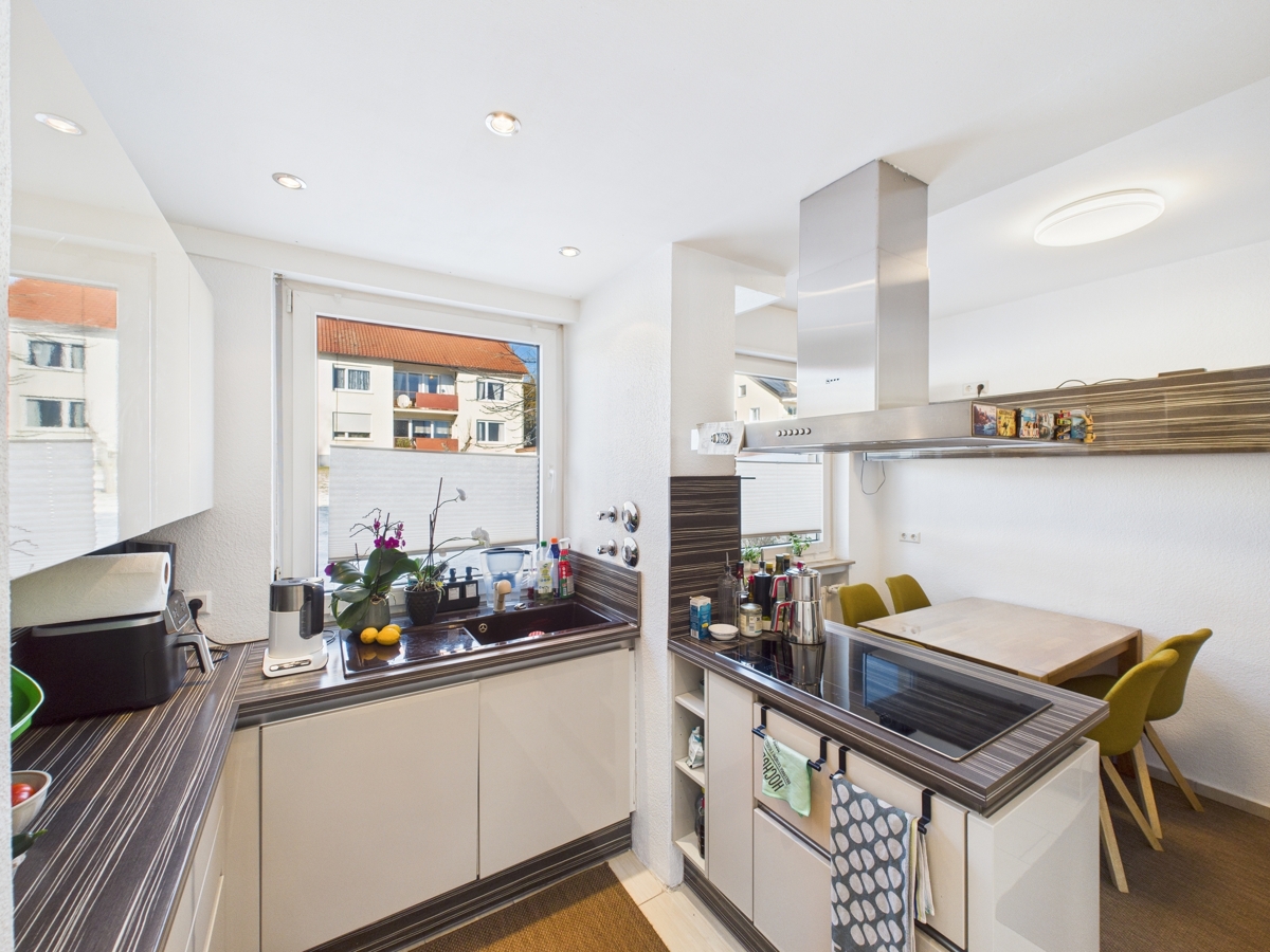 Die große Küche ist funktional gestaltet und ermöglicht eine effiziente Nutzung des Raumes, sowie Platz für einen Esstisch mit 4 Stühlen.