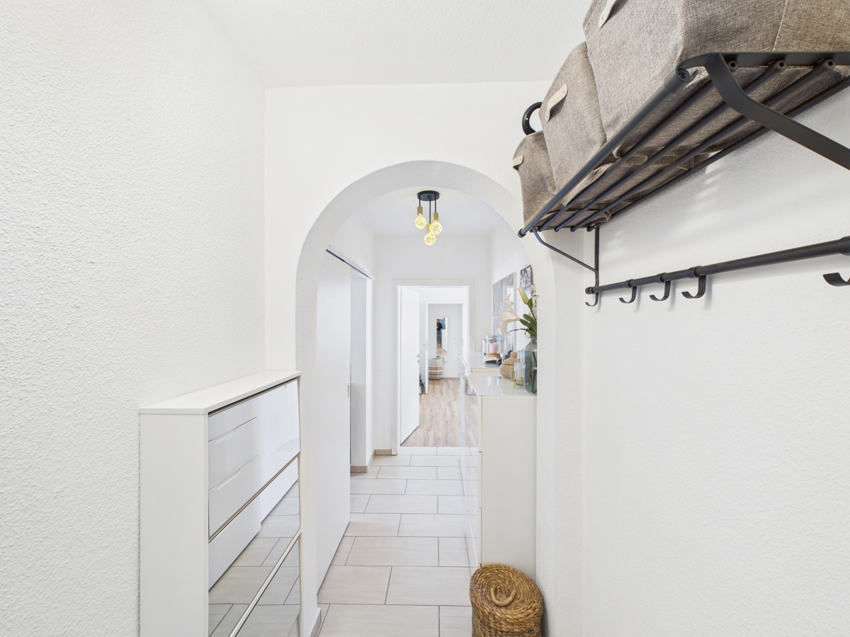 Beim Betreten dieser charmanten Etagenwohnung, werden Sie von einem einladenden Eingangsbereich empfangen, der direkt in den großzügigen Wohnbereich führt.